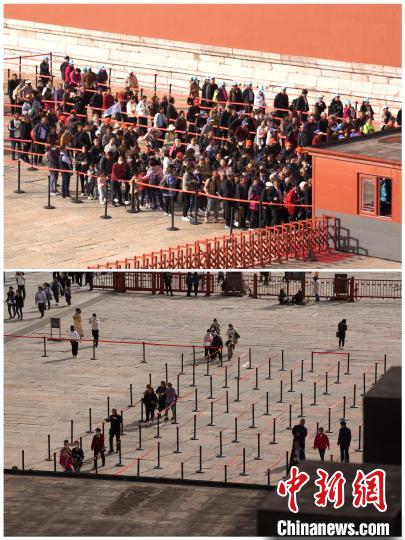上圖為10月20日9時(shí)許,故宮博物院午門(mén)外檢票現(xiàn)場(chǎng);下圖為10月19日13時(shí)許,故宮博物院午門(mén)外檢票現(xiàn)場(chǎng)?!」蕦m博物院供圖