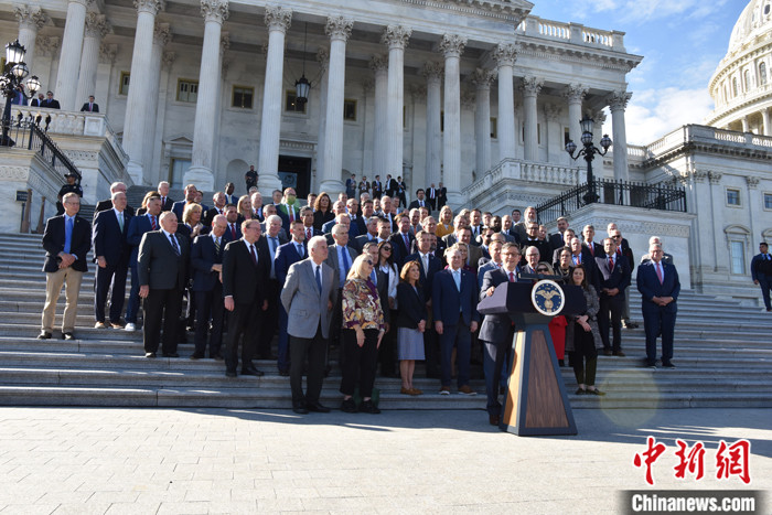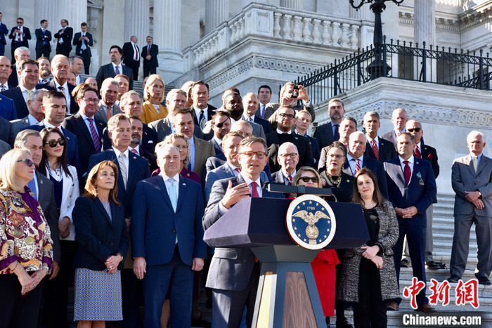 圖為約翰遜當(dāng)選議長(zhǎng)后在記者會(huì)上表示,過去幾周的議長(zhǎng)選舉讓共和黨人“更強(qiáng)大”,“我們將立刻全力以赴開始工作”。 中新社記者 沙晗汀 攝