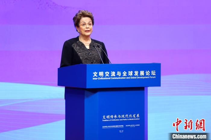 11月7日,由中共中央黨校(國(guó)家行政學(xué)院)主辦的文明交流與全球發(fā)展論壇在京開幕。圖為新開發(fā)銀行行長(zhǎng)羅塞夫作主旨演講。中新社富田 攝