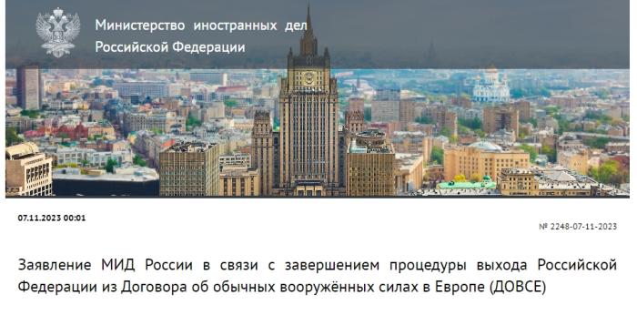 當?shù)貢r間11月7日,俄羅斯外交部發(fā)布關(guān)于俄羅斯完成退出《歐洲常規(guī)武裝力量條約》程序的聲明。圖片來源:俄羅斯外交部網(wǎng)站