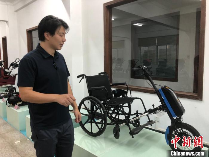 10月17日,臺(tái)灣青年楊博弘向記者介紹公司新產(chǎn)品電動(dòng)輪椅車(chē)頭。中新社記者 孫秋霞 攝