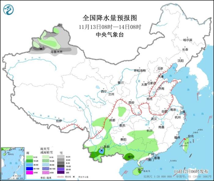 11月13日08時(shí)至14日08時(shí),新疆北部等地部分地區(qū)有小到中雪或雨夾雪,局地大到暴雪(10~12毫米)。湖南南部、四川盆地、貴州南部和東部、云南大部、廣西、廣東北部、海南島、臺(tái)灣島等地部分地區(qū)有小到中雨,其中,云南中部局地有大雨(25~45毫米)。東海南部、臺(tái)灣海峽、臺(tái)灣以東洋面、巴士海峽、南海北部和中部、北部灣、瓊州海峽將有7~8級(jí)、陣風(fēng)9級(jí)的大風(fēng)。