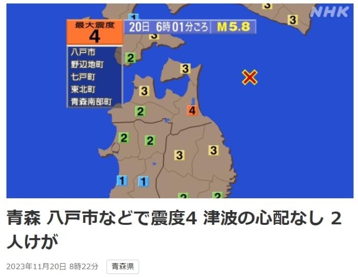 包括青森縣、巖手縣和北海道等多地有明顯震感,離震中較近的青森縣八戶市晃動時間長達(dá)數(shù)十秒,目前有2人在地震中受傷。