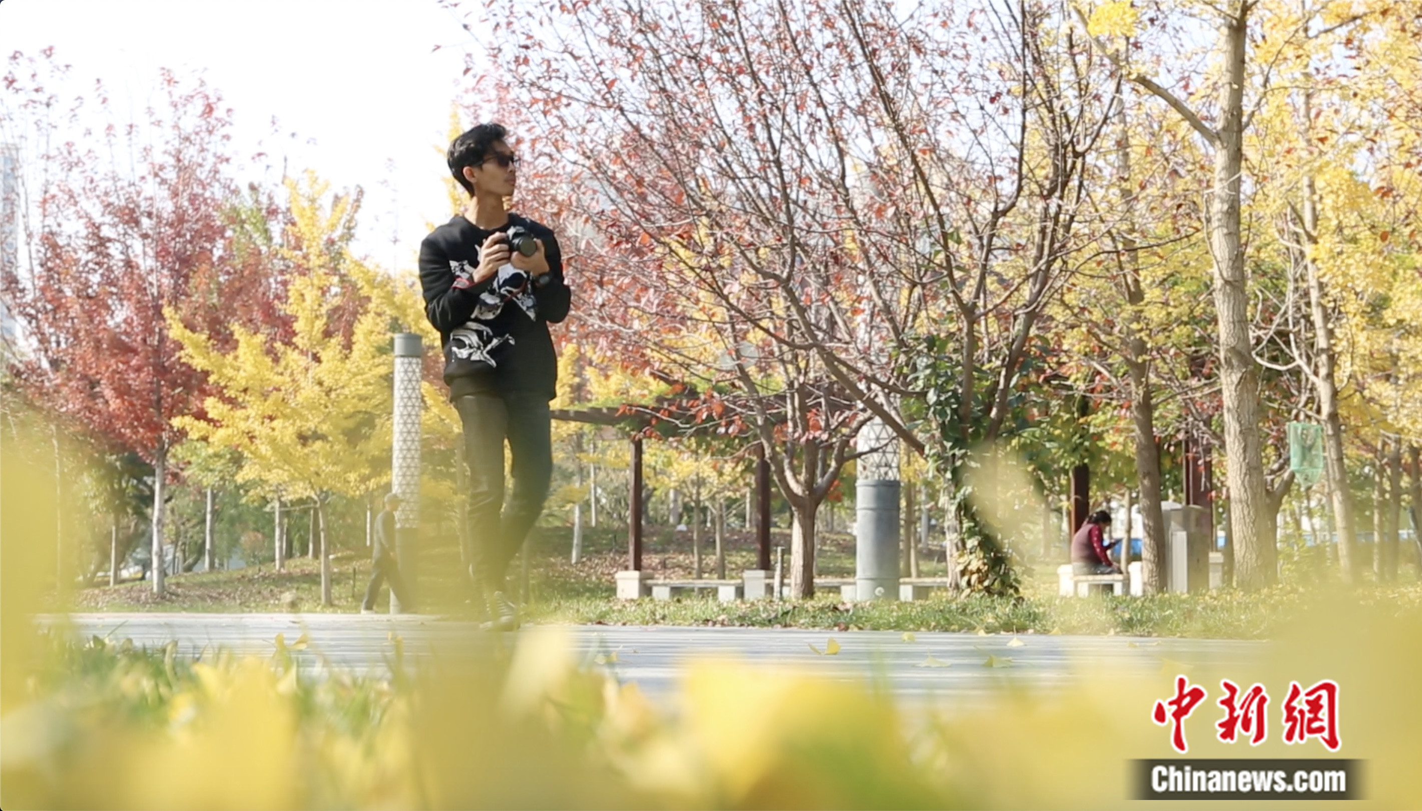 2023年10月,印尼留學生陳君其在校園中漫步,拍攝秋景。高瑩 攝