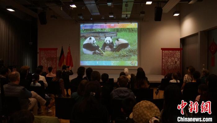 圖為現(xiàn)場(chǎng)播放柏林動(dòng)物園大熊貓雙胞胎成長(zhǎng)紀(jì)錄片。柏林中國(guó)文化中心供圖