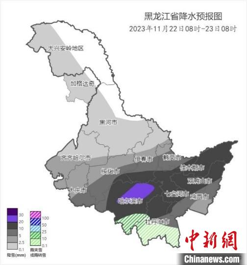 黑龍江省2023年11月22日8時至23日8時累計降水量預報圖。黑龍江省氣象局供圖