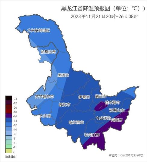 黑龍江省2023年11月21日20時至26日8時降溫預報圖。黑龍江省氣象局供圖
