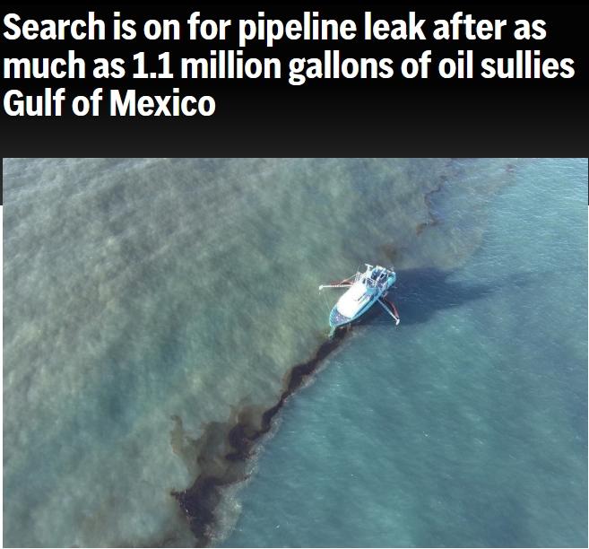 據(jù)報(bào)道,美國國家海洋和大氣管理局(NOAA)稱,當(dāng)?shù)貢r(shí)間16日上午約9點(diǎn),在水面上發(fā)現(xiàn)了一層油膜,10分鐘后,第三海岸中游管道公司報(bào)告了管道泄漏。該機(jī)構(gòu)在網(wǎng)站上表示,當(dāng)天下午2點(diǎn)的一次報(bào)告顯示有3到4英里寬的浮油,“到處都是黑色的油”。
