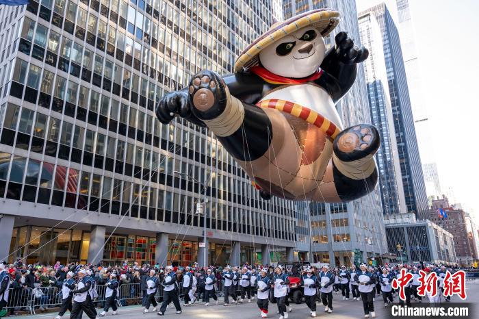 當(dāng)?shù)貢r間11月23日,第97屆梅西百貨感恩節(jié)大游行在美國紐約曼哈頓舉行。圖為基于動畫電影《功夫熊貓》里阿寶的造型設(shè)計的巨型氣球行進(jìn)在曼哈頓街頭?!≈行律缬浾?王帆 攝
