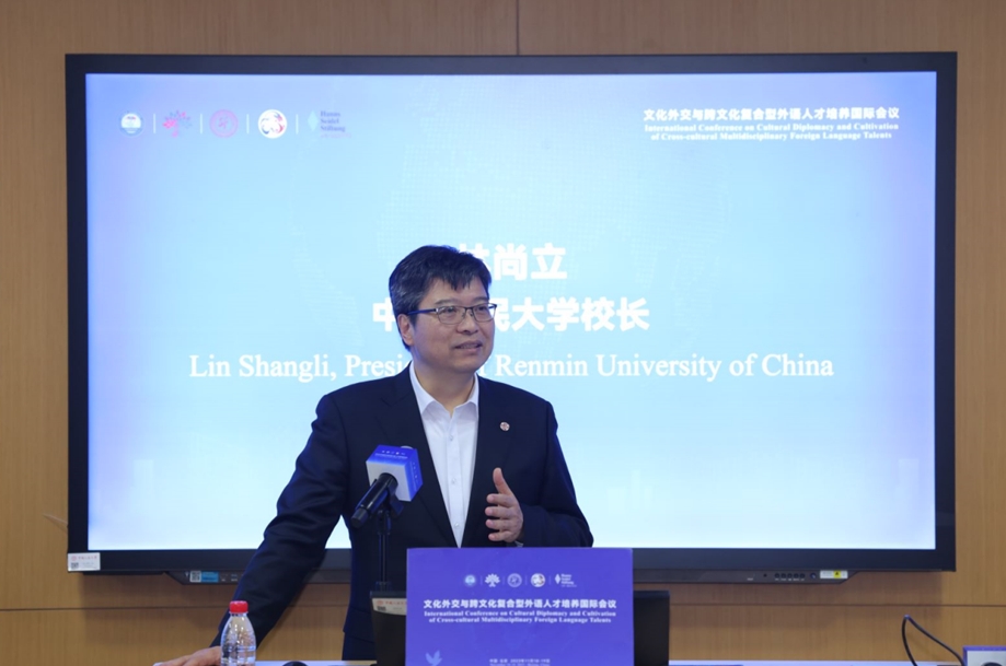 中國人民大學(xué)校長林尚立在會議開幕式致歡迎辭。林尚立表示,文化外交與跨文化復(fù)合型外語人才培養(yǎng)是語言類學(xué)科的必要之舉,此舉對未來人類的發(fā)展會愈發(fā)彰顯其重要性。林尚立認(rèn)為,外語人才的培養(yǎng)應(yīng)該具有文化感、哲學(xué)感,同時(shí)要加深對世界文化的了解,要有世界眼光,希望外語專業(yè)能夠培養(yǎng)出一批真正具有家國情懷、人類情懷,同時(shí)也具有豐厚人文底蘊(yùn)的新一代文化人,培養(yǎng)出跨文化的文化外交者、跨文化的文化促進(jìn)者。