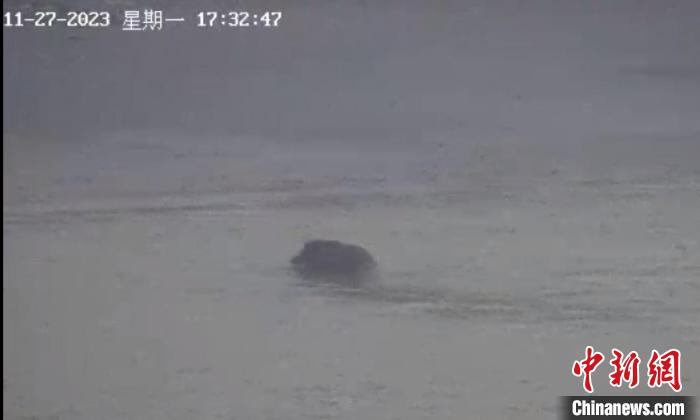 27日傍晚,南京海事局交管中心值班人員在通過長江三橋上的攝像頭例行巡查時(shí),意外地發(fā)現(xiàn)江面上有一頭野豬在游泳。江蘇海事局 供圖