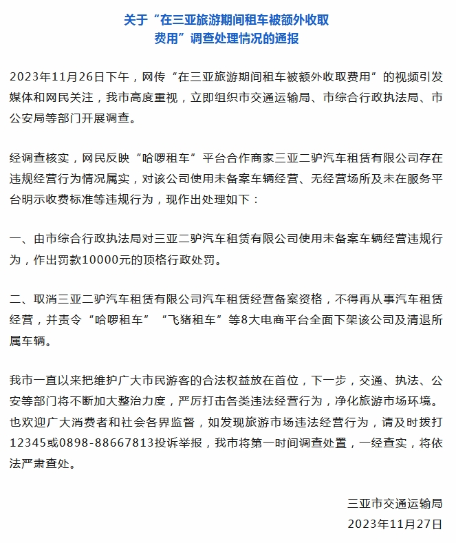 經(jīng)調(diào)查核實(shí),網(wǎng)民反映“哈啰租車”平臺(tái)合作商家三亞二驢汽車租賃有限公司存在違規(guī)經(jīng)營行為情況屬實(shí),對(duì)該公司使用未備案車輛經(jīng)營、無經(jīng)營場所及未在服務(wù)平臺(tái)明示收費(fèi)標(biāo)準(zhǔn)等違規(guī)行為,現(xiàn)作出處理如下: