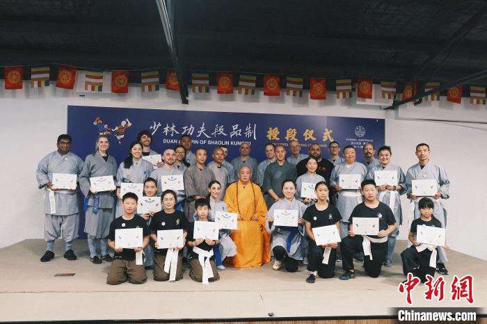 當(dāng)?shù)貢r間12月1日,澳大利亞少林寺禪武堂于1日在悉尼隆重舉行大洋洲少林功夫段品制授段儀式,少林寺方丈釋永信親臨現(xiàn)場,為當(dāng)?shù)厣倭止Ψ驉酆谜呤谟瓒挝弧?張浩鑫 攝)
