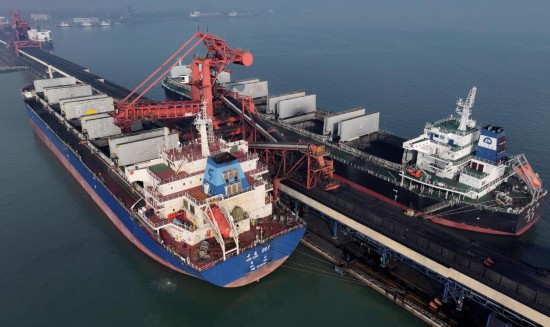 12月5日,兩艘輪船靠泊在唐山港曹妃甸港區(qū)國投曹妃甸港口有限公司煤炭碼頭裝貨(無人機(jī)照片)。新華社記者楊世堯攝