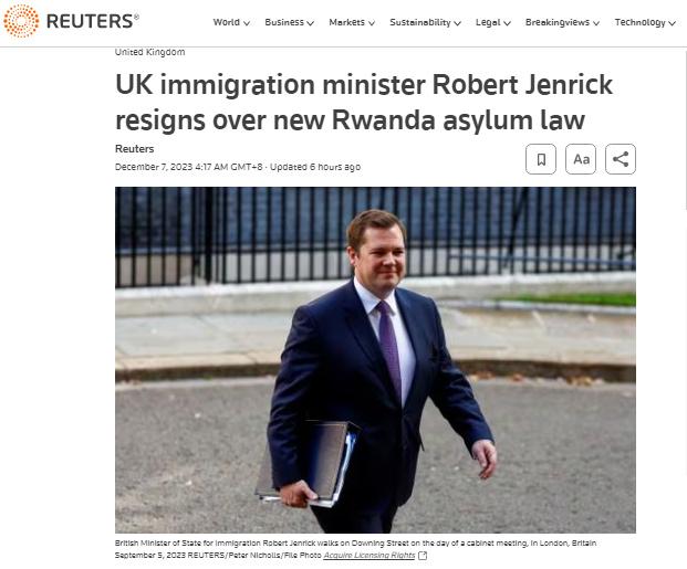 報道稱,詹里克對英國政府當(dāng)日公布的“盧旺達安全(庇護和移民)法案草案”持有不同意見。他在一封辭職信中表示,該立法是在2024年英國大選之前解決移民危機的“最后機會之一”。