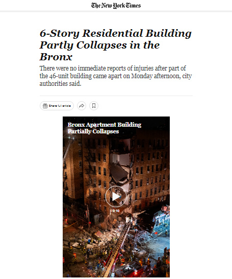 中新網(wǎng)12月12日電 據(jù)《紐約時(shí)報(bào)》報(bào)道,當(dāng)?shù)貢r(shí)間11日下午,美國(guó)紐約市布朗克斯區(qū)一棟建筑發(fā)生部分坍塌,目前暫無(wú)人員傷亡報(bào)告。