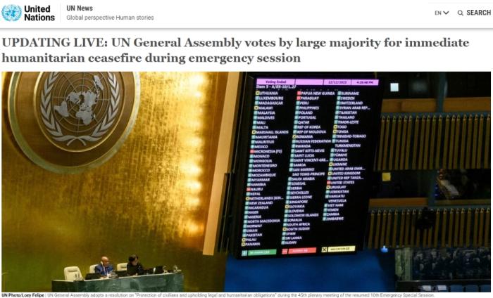 中新網(wǎng)12月13日電 據(jù)聯(lián)合國新聞網(wǎng)消息,當(dāng)?shù)貢r(shí)間12日,聯(lián)合國大會(huì)針對(duì)巴以沖突召開緊急會(huì)議,并討論了一項(xiàng)呼吁加沙立即實(shí)現(xiàn)人道主義停火的決議。