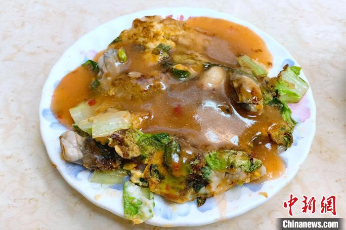 近日,臺北寧夏夜市里圓環(huán)邊蚵仔煎店的蚵仔煎。 中新社記者 陳小愿 攝