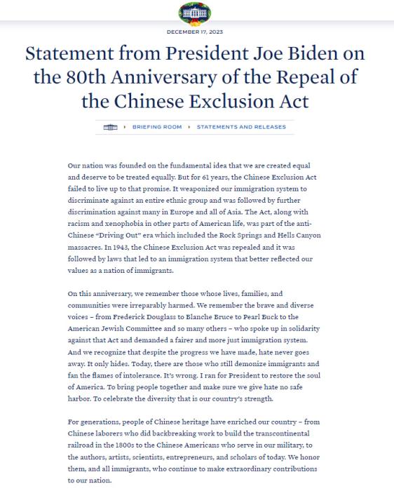 中新網(wǎng)12月18日電 綜合報(bào)道,當(dāng)?shù)貢r(shí)間17日,美國總統(tǒng)拜登就廢除排華法案80周年發(fā)表文告。美國華人聯(lián)合會(huì)(UCA)會(huì)長薛海培表示,這是白宮141年來首次正式譴責(zé)排華法案的歷史性文件,這使得華人和亞裔社區(qū)追求平等待遇的歷史性努力又向前邁進(jìn)了一大步。