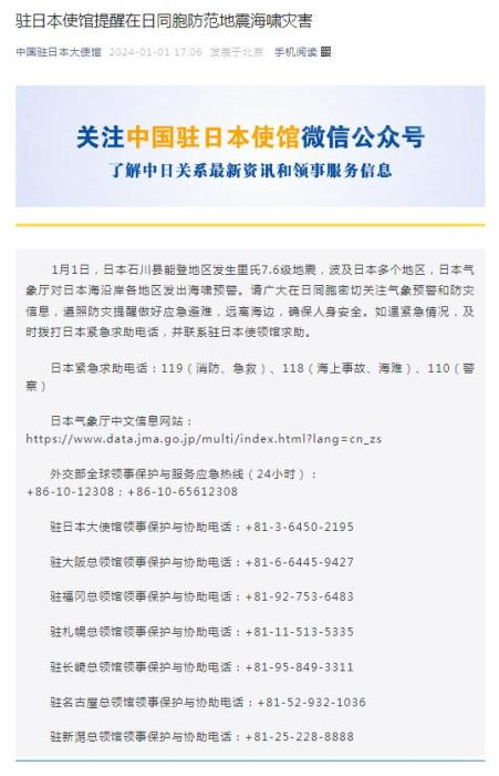 中新網(wǎng)1月1日電 據(jù)中國駐日本大使館官方公眾號(hào)消息,1月1日,日本石川縣能登地區(qū)發(fā)生里氏7.6級(jí)地震,波及日本多個(gè)地區(qū),日本氣象廳對(duì)日本海沿岸各地區(qū)發(fā)出海嘯預(yù)警。請(qǐng)廣大在日同胞密切關(guān)注氣象預(yù)警和防災(zāi)信息,遵照防災(zāi)提醒做好應(yīng)急避難,遠(yuǎn)離海邊,確保人身安全。如遇緊急情況,及時(shí)撥打日本緊急求助電話,并聯(lián)系駐日本使領(lǐng)館求助。