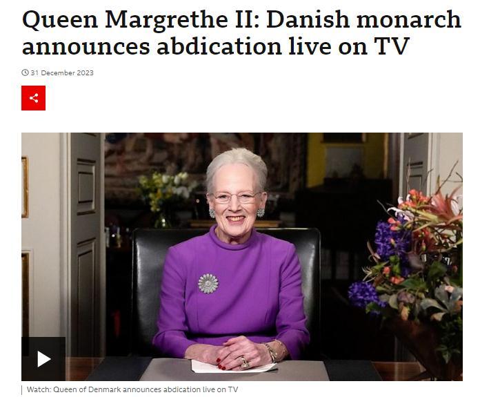 中新網(wǎng)1月1日電 綜合外媒報道,當?shù)貢r間2023年12月31日,現(xiàn)年83歲的丹麥女王瑪格麗特二世在發(fā)表新年致辭時宣布,2024年1月14日是她登基52周年紀念日,屆時她將退位,把王位傳給其兒子腓特烈王儲。
