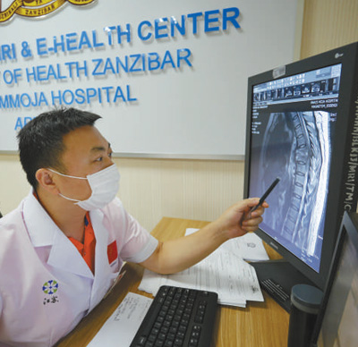 從第一臺X光機(jī)、CT設(shè)備,再到目前整個桑給巴爾地區(qū)唯一一臺核磁共振機(jī),納茲莫加醫(yī)院影像科的設(shè)備物資都來自中國捐贈。不久前,影像科還增添了遠(yuǎn)程視頻設(shè)備。通過遠(yuǎn)程技術(shù),中國醫(yī)療隊(duì)可以對接中國國內(nèi)優(yōu)質(zhì)醫(yī)療資源,對當(dāng)?shù)貜?fù)雜病例進(jìn)行在線會診。桑給巴爾地區(qū)現(xiàn)有的5名影像科醫(yī)生,就是在一批批中國醫(yī)療隊(duì)隊(duì)員的帶教下成長起來的。