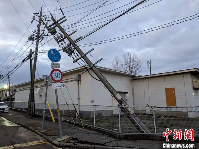圖為1月1日,石川縣金澤市道路旁的電線桿因地震傾斜歪倒。 中新社發(fā) 鐘欣 攝