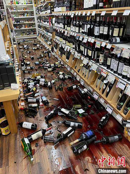 圖為1月1日,石川縣金澤市一家超市內(nèi)酒類貨架上的商品因地震散落、破碎。 中新社發(fā) 鐘欣 攝