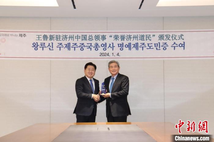 1月4日,韓國(guó)濟(jì)州道知事吳憐勛(左)向中國(guó)駐濟(jì)州總領(lǐng)事王魯新頒授“榮譽(yù)濟(jì)州道民”證書(shū)。(中國(guó)駐濟(jì)州總領(lǐng)事館供圖)