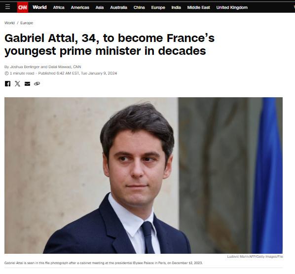 據(jù)報(bào)道,現(xiàn)任法國國民教育和青年部長(zhǎng)阿塔爾,將成為自1958年法蘭西第五共和國成立以來該國最年輕的總理。