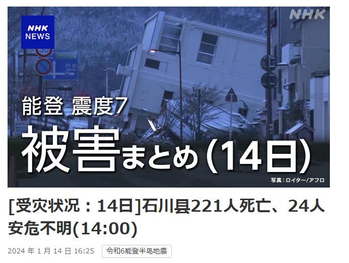 中新網(wǎng)1月14日電 據(jù)日本廣播協(xié)會(NHK)報道,日本石川縣最新統(tǒng)計數(shù)據(jù)顯示,截至當?shù)貢r間14日下午2時,日本石川縣能登地區(qū)1日發(fā)生的7.6級地震已造成221人遇難。