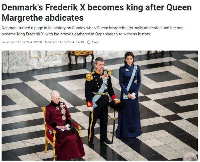 當(dāng)天早些時(shí)候,丹麥女王瑪格麗特二世宣布退位?,敻覃愄囟莱錾?940年,于1972年繼位。她于2023年12月31日發(fā)表新年致辭時(shí)宣布了退位消息。