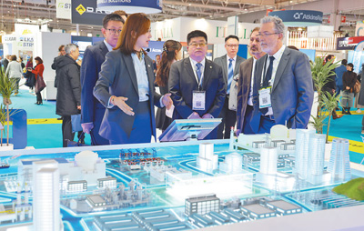 2023年11月在法國巴黎舉辦的第五屆世界核能工業(yè)博覽會上,中國核工業(yè)集團(tuán)工作人員在向法國原子能委員會負(fù)責(zé)人介紹展出內(nèi)容。