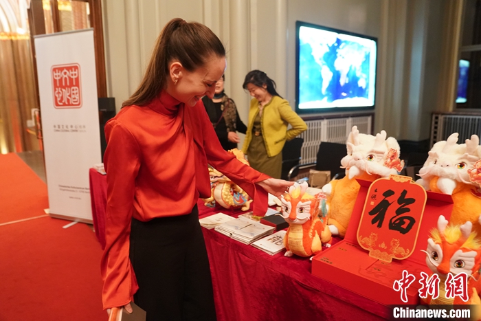 柏林中國文化中心還在現(xiàn)場設(shè)置了文化展臺,向來賓展示來自中國的精美文創(chuàng)藝術(shù)品和文化旅游推廣品,龍年的“吉祥龍”深受來賓喜愛。
