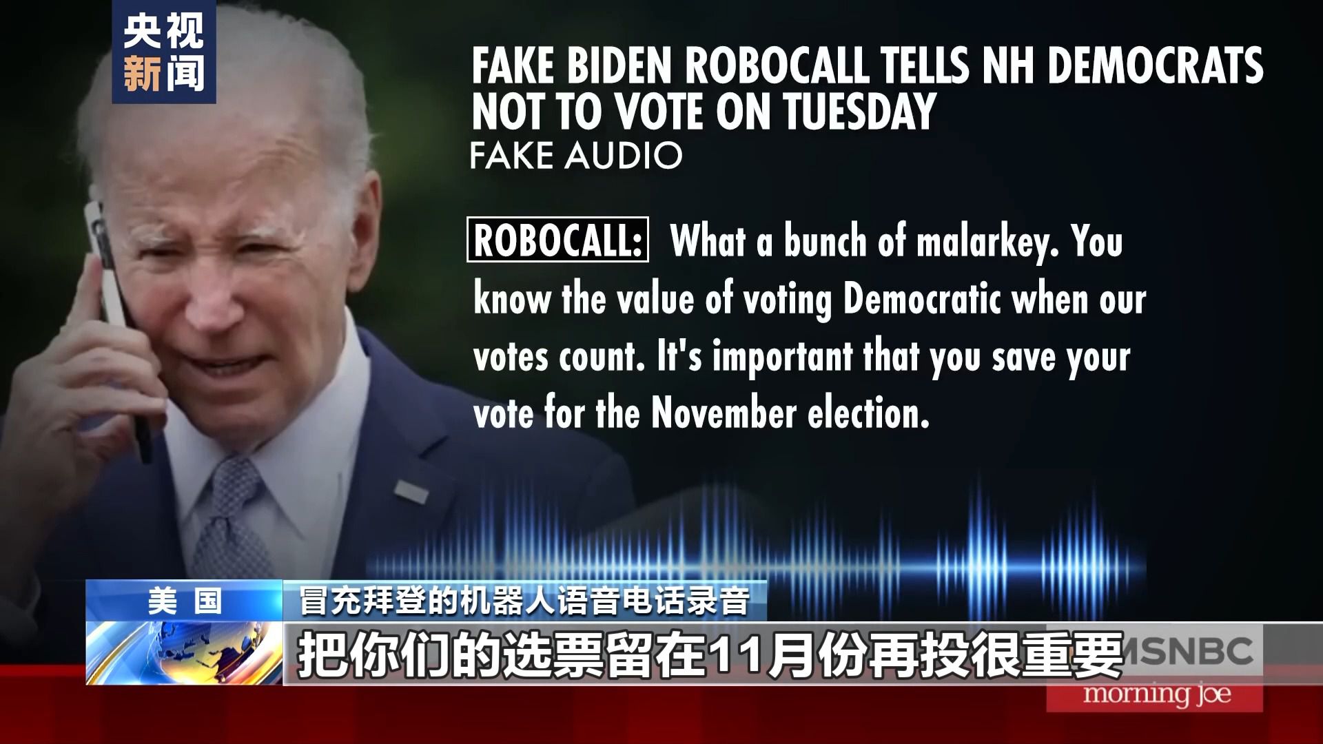冒充拜登的機器人語音電話錄音:把你們的選票留在11月份再投很重要。在這周二(23日)投票,只會讓共和黨人得逞,讓特朗普再次當(dāng)選為共和黨候選人。