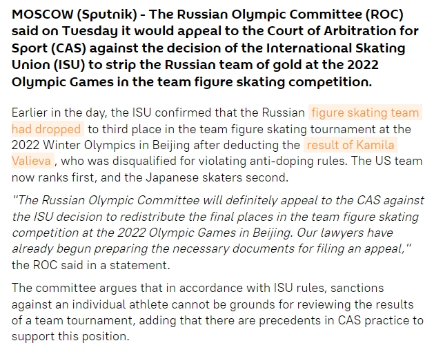 據(jù)俄羅斯衛(wèi)星通訊社報(bào)道,俄羅斯奧委會(huì)也在當(dāng)?shù)貢r(shí)間30日表示,將針對(duì)俄羅斯花滑運(yùn)動(dòng)員卡米拉·瓦利耶娃被處以禁賽并取消北京冬奧會(huì)俄羅斯奧委會(huì)代表團(tuán)花滑團(tuán)體金牌一事,向國(guó)際體育仲裁法庭提起上訴。