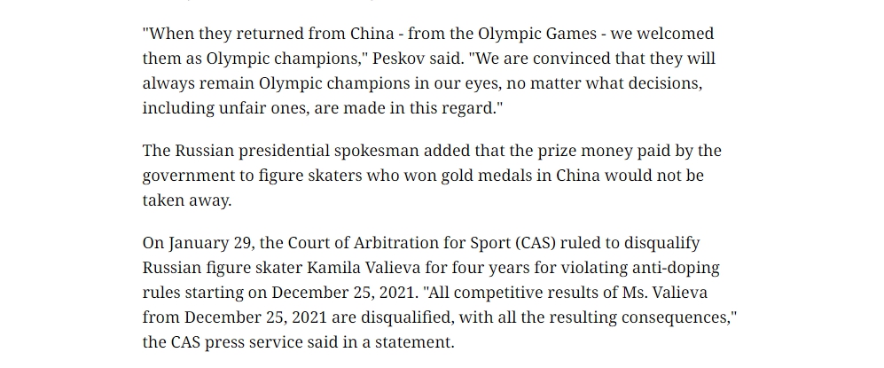 據(jù)塔斯社報(bào)道,佩斯科夫表示,無(wú)論國(guó)際體育組織作出什么決定,俄羅斯人會(huì)永遠(yuǎn)將卡米拉·瓦利耶娃和其他花樣滑冰運(yùn)動(dòng)員視為冬奧冠軍。