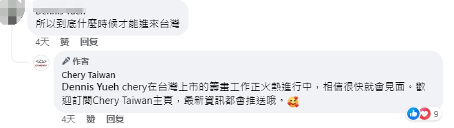 早前,奇瑞官方在臉書創(chuàng)立“Chery Taiwan”,并從去年開始更新專業(yè)內(nèi)容,針對一款中型運(yùn)動(dòng)型多用途汽車已多次發(fā)布宣傳影片。有不少臺(tái)灣網(wǎng)友在該賬號(hào)咨詢該款汽車何時(shí)會(huì)在臺(tái)灣上市,該賬號(hào)回復(fù),目前在臺(tái)灣上市的籌劃工作正火熱進(jìn)行中,相信很快就會(huì)見面。