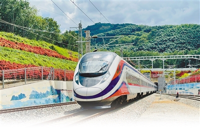 “瀾滄號(hào)”動(dòng)車(chē)組從中老鐵路友誼隧道穿行而過(guò)。