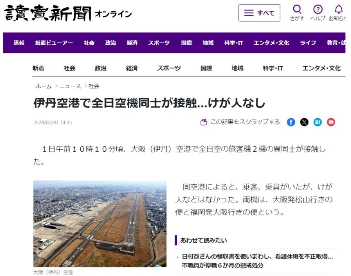 中新網(wǎng)2月1日電 據(jù)日本《讀賣新聞》報道,當?shù)貢r間2月1日上午10時10分許,日本大阪伊丹機場的2架客機機翼部位發(fā)生擦碰。