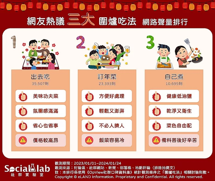 農歷新年即將到來,而重頭戲之一便是除夕時端上桌的年夜飯!觀察近一年臺灣網(wǎng)友針對“圍爐吃法”相關話題的討論,可以發(fā)現(xiàn)近年不少人為了避免自行下廚的繁復工程,紛紛選擇在除夕時出去吃年夜飯,只需一通電話預約,即可輕松享用美味的菜肴,省心又省事。