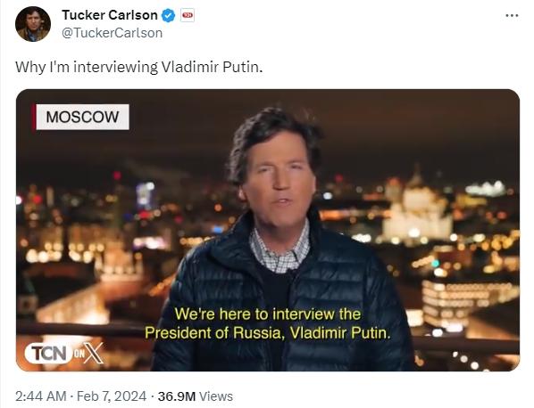 據(jù)介紹,卡爾森是??怂闺娨暸_的一名當(dāng)紅主播,主要負(fù)責(zé)一檔名為《卡爾森今夜秀》的新聞節(jié)目。他在2023年4月被??怂菇夤停S后在社交平臺X上繼續(xù)發(fā)布采訪節(jié)目。路透社稱,卡爾森2023年8月在X上發(fā)布的對美國前總統(tǒng)特朗普的采訪獲得了上億播放量。