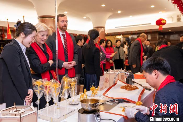 當(dāng)?shù)貢r(shí)間2月6日,中國(guó)常駐聯(lián)合國(guó)代表團(tuán)在紐約駐地舉行龍年新春招待會(huì)。圖為來(lái)賓們?cè)谔钱嬚古_(tái)觀看糖人制作工藝。 中新社記者 王帆 攝