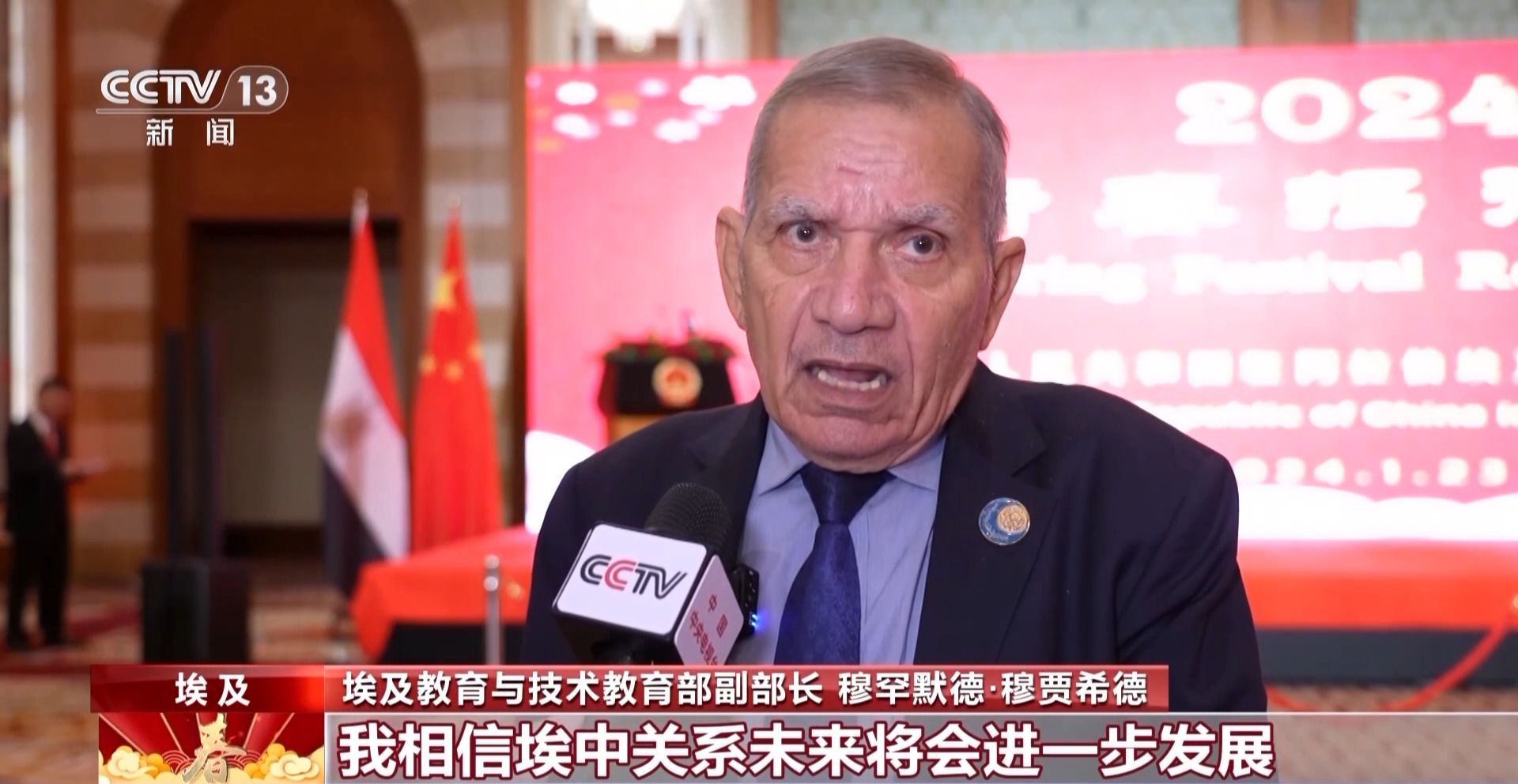 埃及教育與技術(shù)教育部副部長(zhǎng) 穆罕默德·穆賈希德:我相信埃中關(guān)系未來(lái)將會(huì)進(jìn)一步發(fā)展并實(shí)現(xiàn)更多合作,我想借此機(jī)會(huì)向中國(guó)人民致以春節(jié)的問(wèn)候。