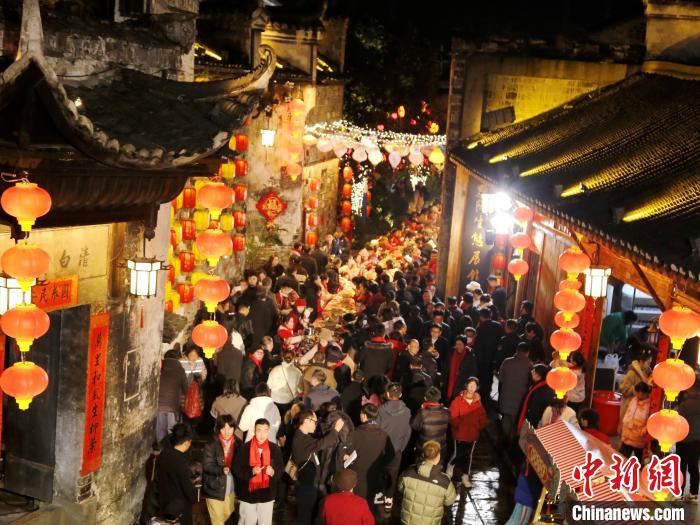 中新網(wǎng)懷化2月10日電 (付敬懿 李林)“開席咯,上頭碗,大吉大利,黃精燉雪峰烏骨雞;第二碗,前程似錦,黔陽雪粑鴨;第三碗,牛氣沖天,干鍋高山黃牛肉;第四碗,年年有余,黃燜昌齡魚……”2月9日晚,除夕夜,湖南懷化洪江市黔陽古城內(nèi),一張張桌子擺滿大街小巷,當?shù)鼐用窈陀慰凸矅L長龍宴,歡迎龍年到來。