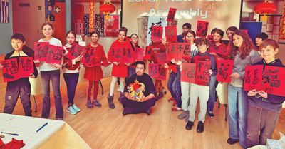 在招待會上,來賓們在書法展臺學(xué)寫“?!弊趾痛郝?lián),在版畫展臺體驗中國雕版印刷技藝,體驗中國非遺和年俗互動項目,了解中國傳統(tǒng)文化的悠久歷史和傳承發(fā)展等。
