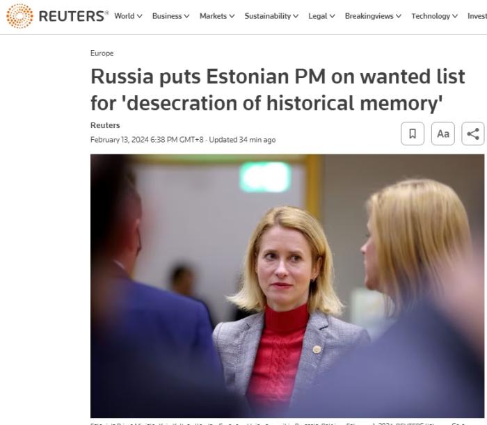 中新網(wǎng)2月13日電 據(jù)路透社13日援引俄內(nèi)政部消息,俄方將愛沙尼亞總理卡拉斯列入通緝名單。