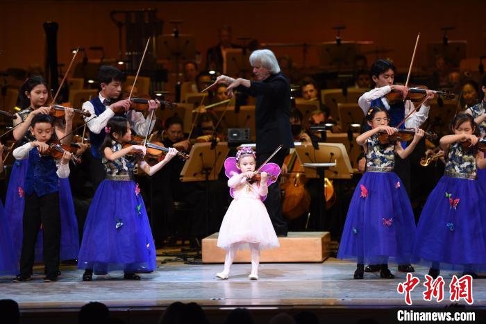 當(dāng)?shù)貢r間2月10日晚,美國太平洋交響樂團(tuán)與橙郡音樂與舞蹈藝術(shù)中心的孩子們合作演奏小提琴協(xié)奏曲《梁?!??!≈行律缬浾? 張朔 攝
