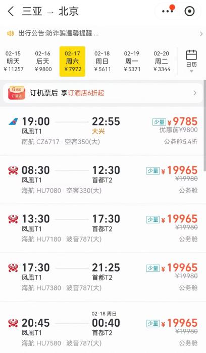 另外,如果條件允許,錯(cuò)峰返程也是個(gè)好辦法。例如,從哈爾濱到北京,17日機(jī)票最低需要6000多元,但如果選擇19日回,機(jī)票價(jià)格降到1500元左右,直接省下4000多元。同樣的情況也發(fā)生在哈爾濱到上海、三亞到重慶等航線上。