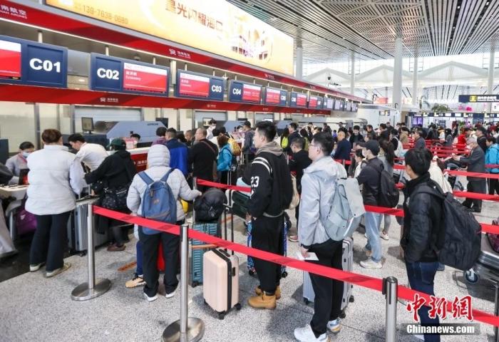 2月8日,海南???,旅客在??诿捞m國(guó)際機(jī)場(chǎng)T2航站樓排隊(duì)辦理值機(jī)。春節(jié)臨近,??诿捞m國(guó)際機(jī)場(chǎng)客流攀升。中新社記者 駱云飛 攝